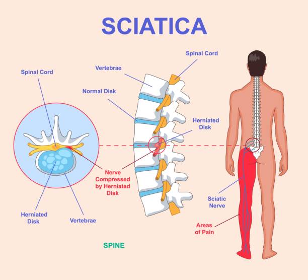 Sciatica refers to pain that radiates along the sciatic nerve, starting from the lower back and traveling down to the legs. It is commonly caused by conditions like slip disc, spinal stenosis, or nerve compression, leading to discomfort, numbness, or weakness in the legs.